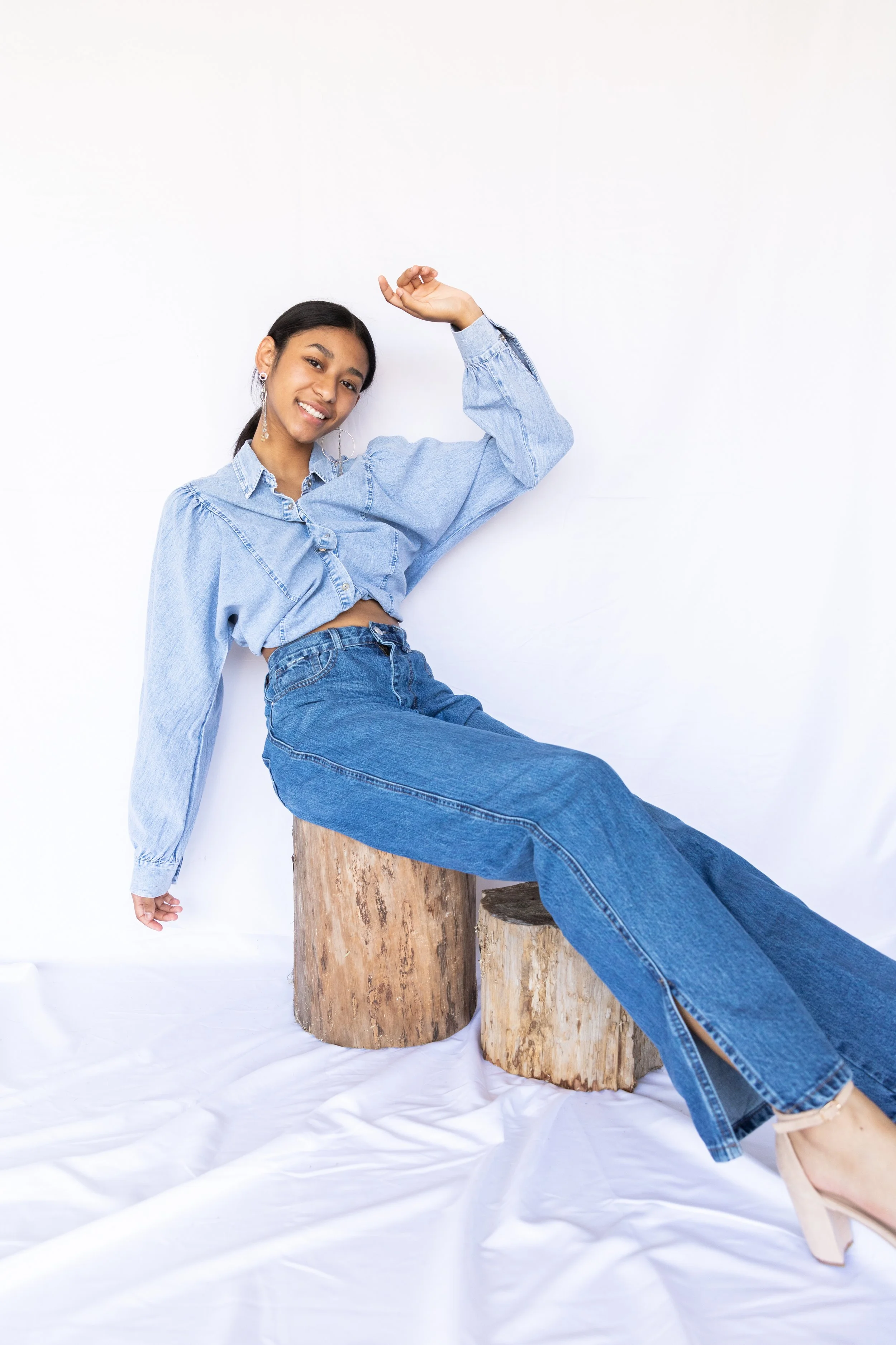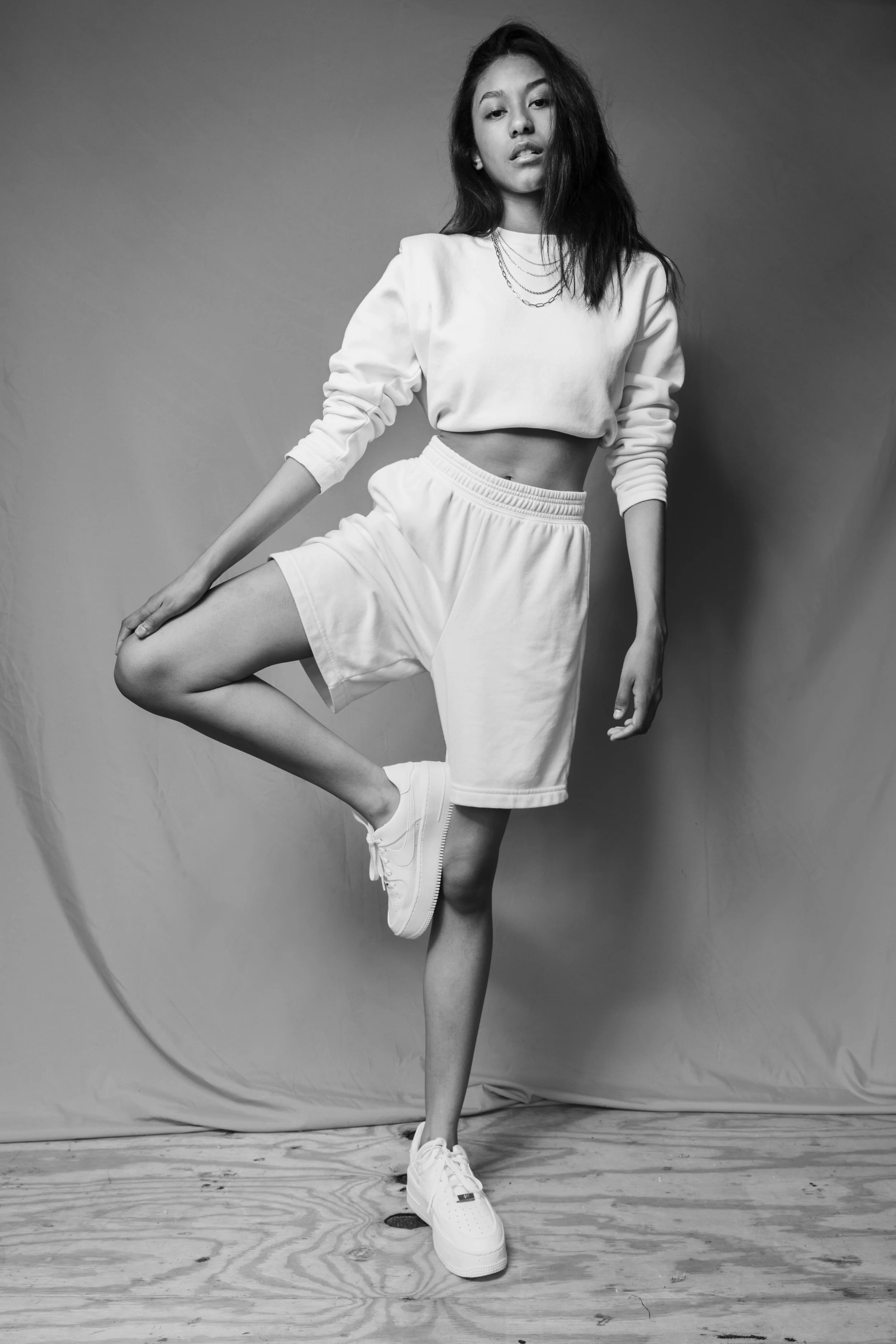 by the time we hit editorial, she was warmed up and confident. we pulled the seamless, found a textured wall, and let the light get a little more dramatic. this is where test shoots get fun — the looser, more expressive frames that show an agent her personality. movement, edge, the kind of images that make a casting director pause on a thumbnail. her wildcard look pulled exactly that out of her.