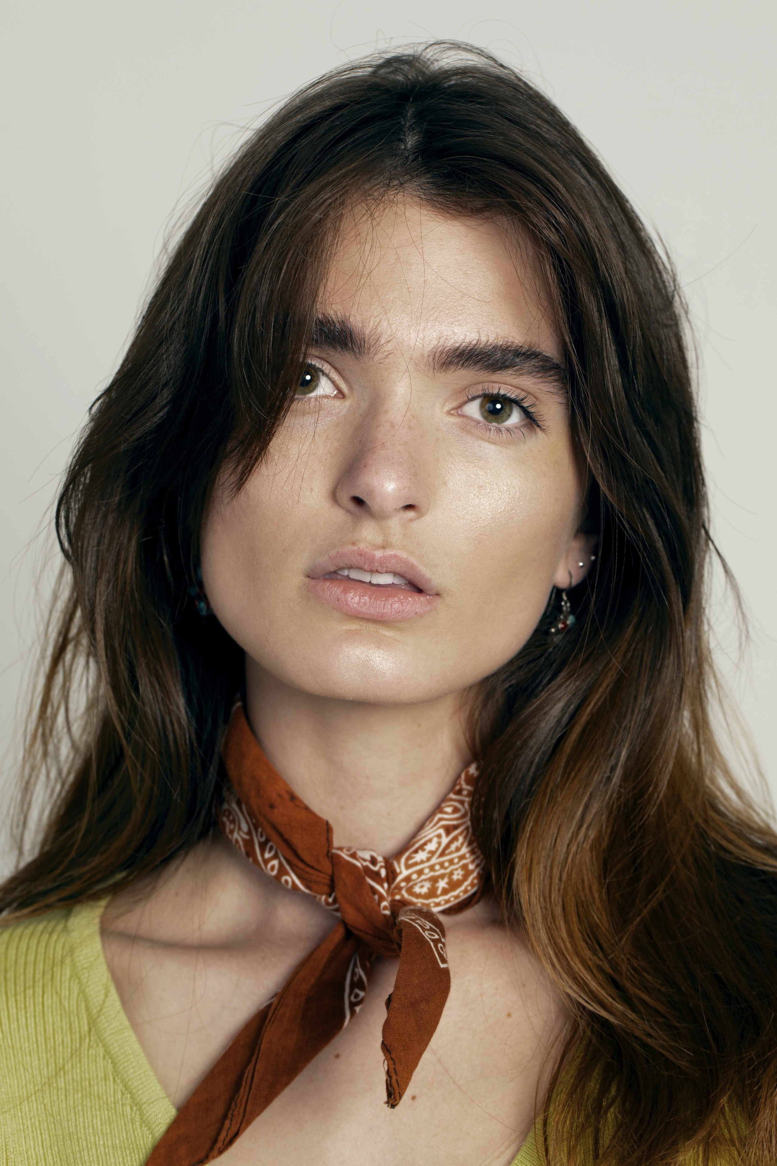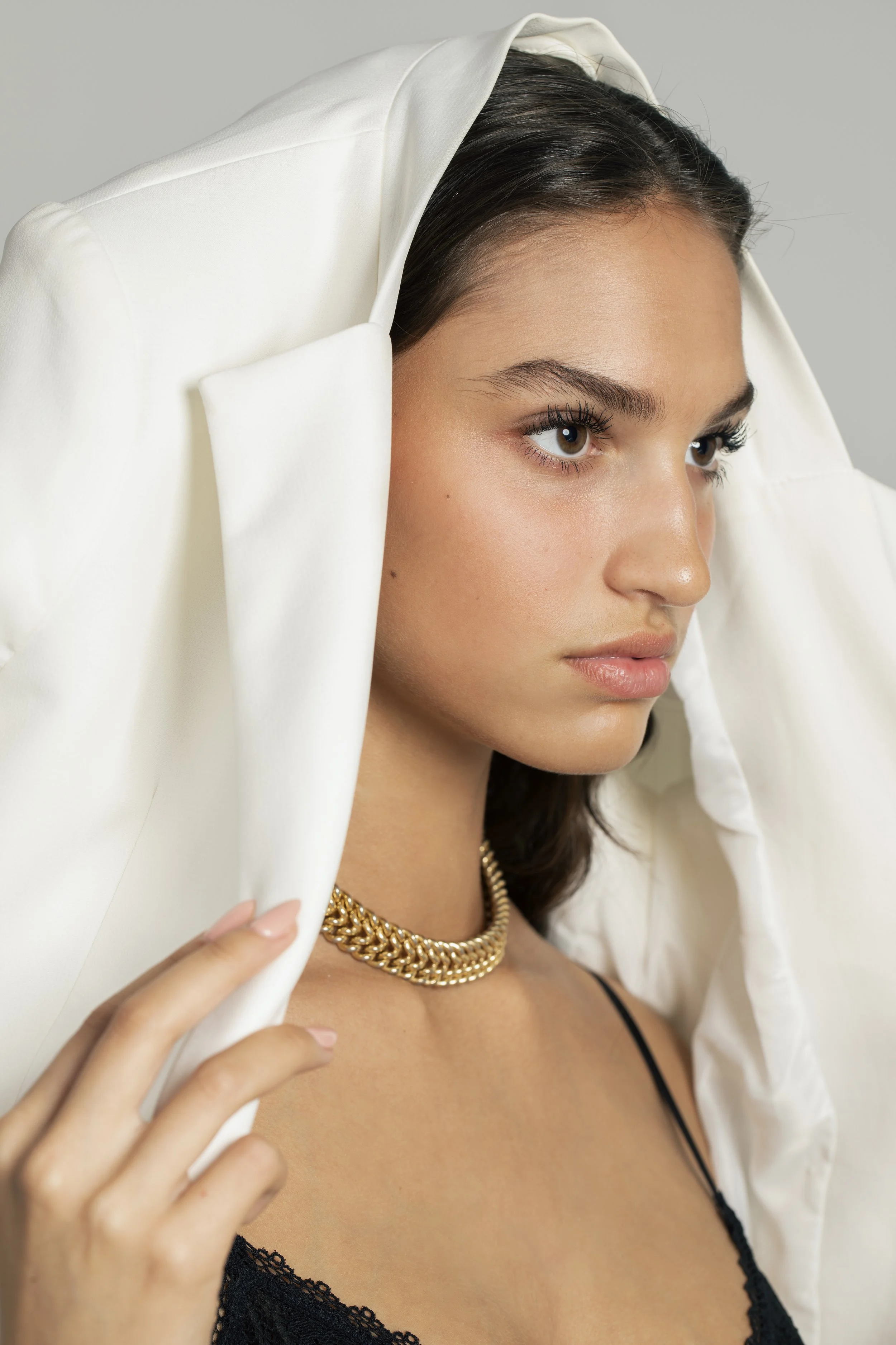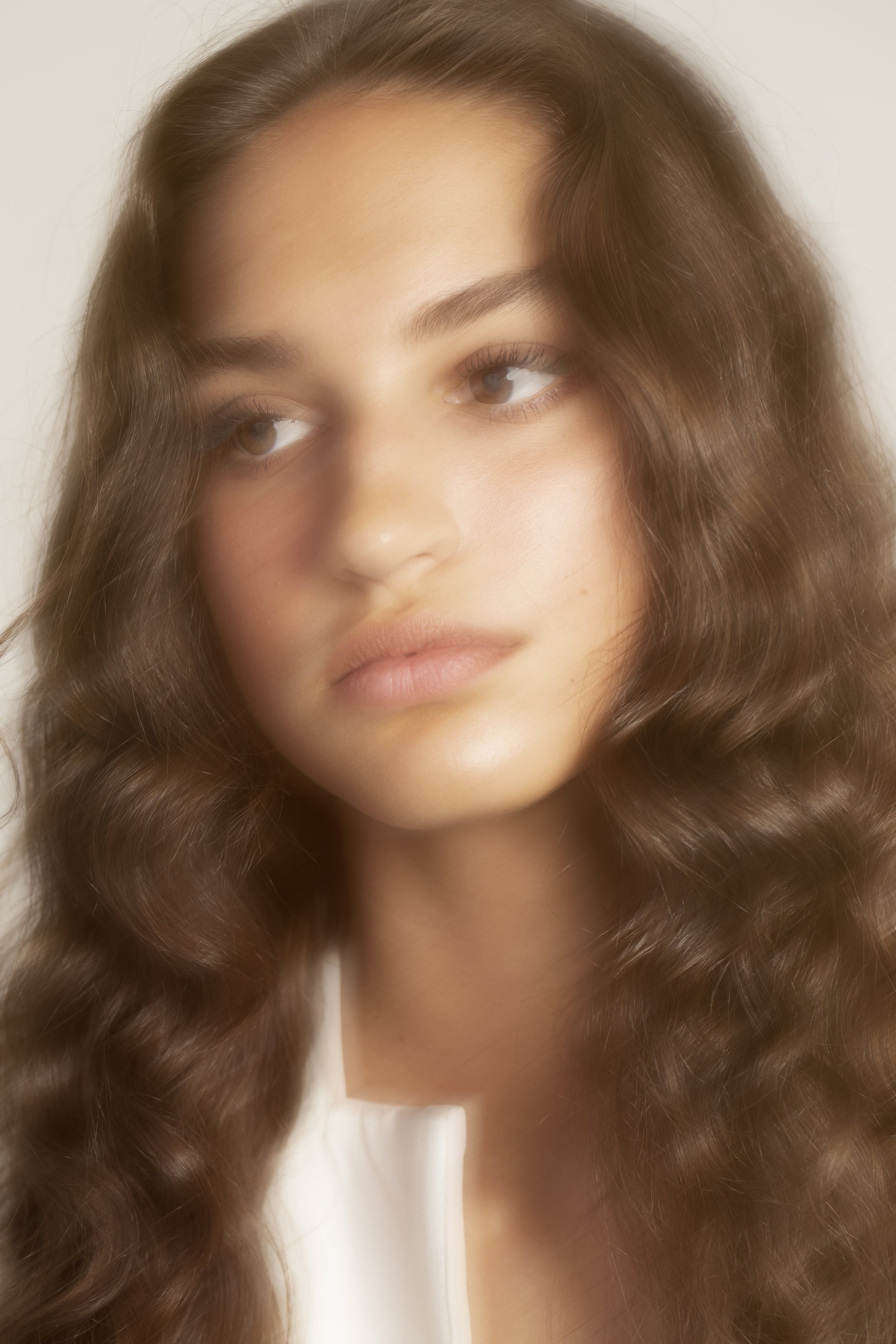 we started with bebe. there’s a stillness in the way she carries her face — a kind of quiet confidence that doesn’t need to push — so we built her set around that. one big soft source, feathered just past her cheekbone, with a v-flat on the shadow side to keep her skin glowing without flattening it. neutral wardrobe, hands close to the collarbone, eyes steady. the goal was a beauty story that any agency could pull a clean headshot from, plus a few editorial frames where the only real movement is in her gaze.